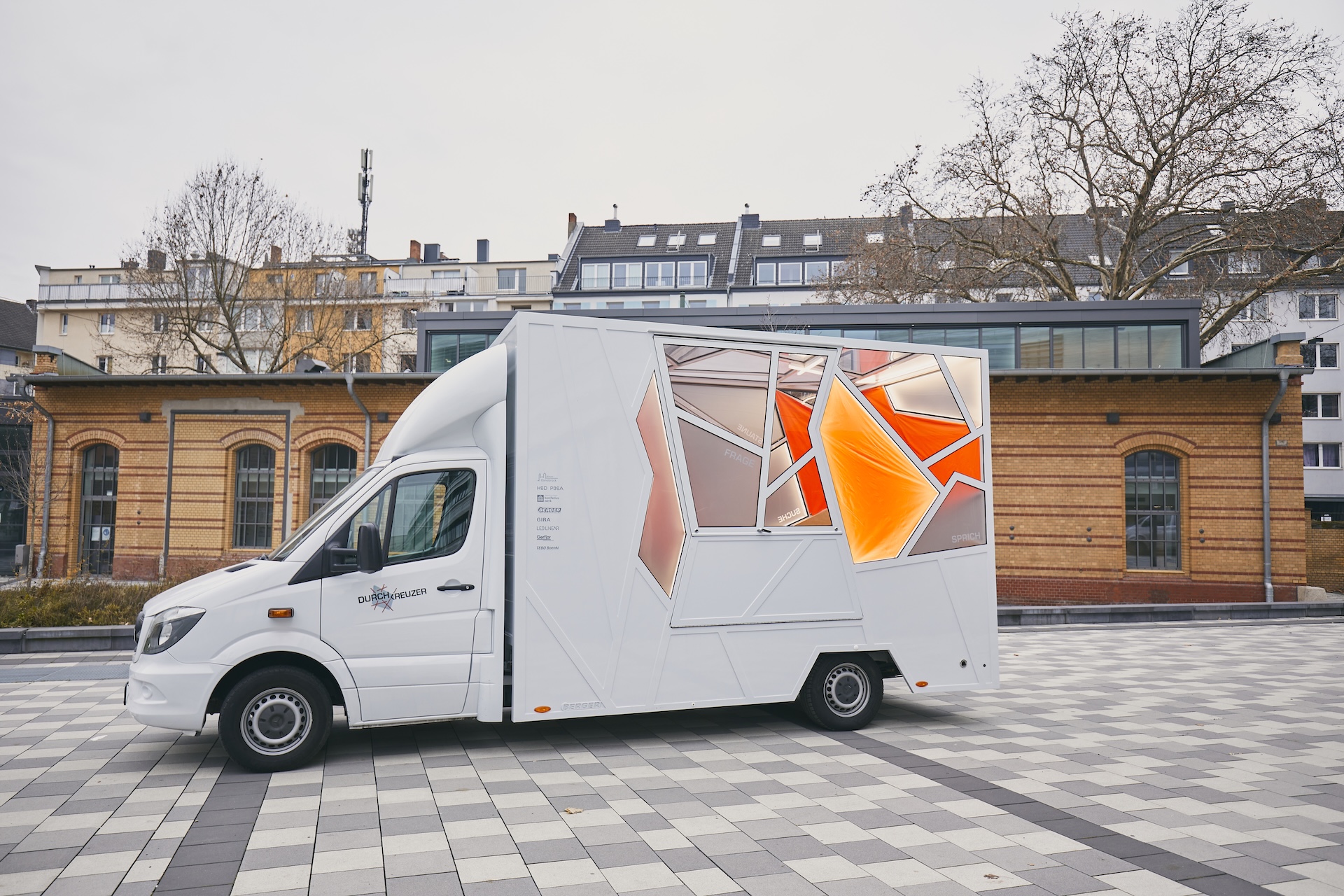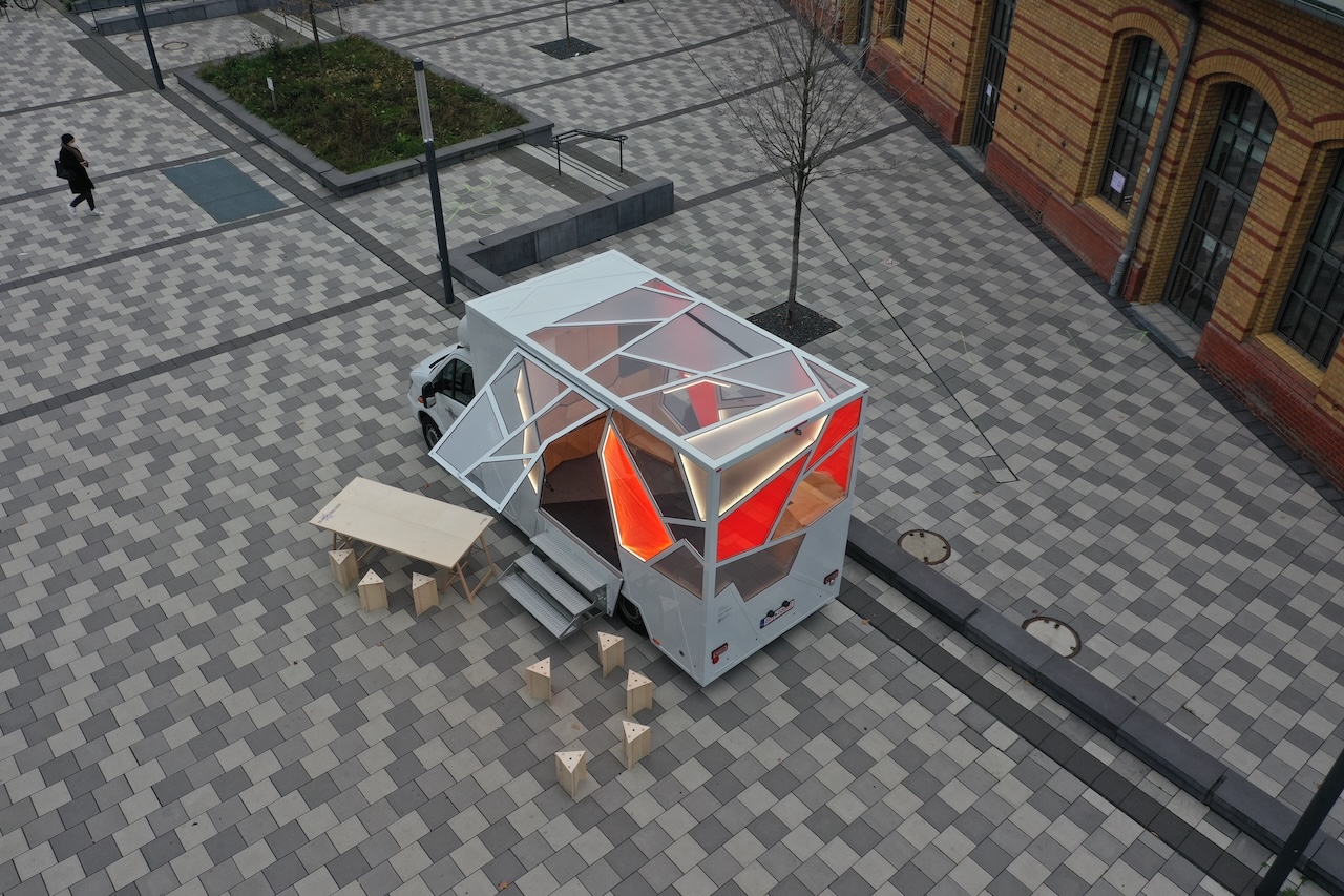 Ein flexibel einsetzbarer, mobiler Kommunikationsraum für junge Menschen bietet Orte für Begegnung, Rückzug und Austausch. Eine grobmaschige Netzstruktur umhüllt den Aufbau, schafft Transparenz und zugleich geschützte Bereiche. Innen sorgen eine durchgehende Sitzbank und eine multifunktionale Schrankwand für klare Raumstruktur und fördern Kommunikation ohne Trennung. Die Möbelformen orientieren sich an der Außenstruktur und sind platzsparend integriert. Farblich kombiniert das Konzept neutrales Weiß mit Neon-Orange, Buchenholz, Eisbirke und grauem Filz – eine Balance aus Frische und Wärme. Die Beleuchtung ist unsichtbar in die Netzstruktur eingebettet und unterstreicht deren Wirkung. Der Raum kann überall eingesetzt werden – bei Festivals, Stadtfesten, am Strand oder auf dem Schulhof – und schafft eine einladende, architektonisch hochwertige Atmosphäre. Er steht für eine zeitgemäße Form der Jugendarbeit, die sich bewegt, anpasst und dort ist, wo sie gebraucht wird.
