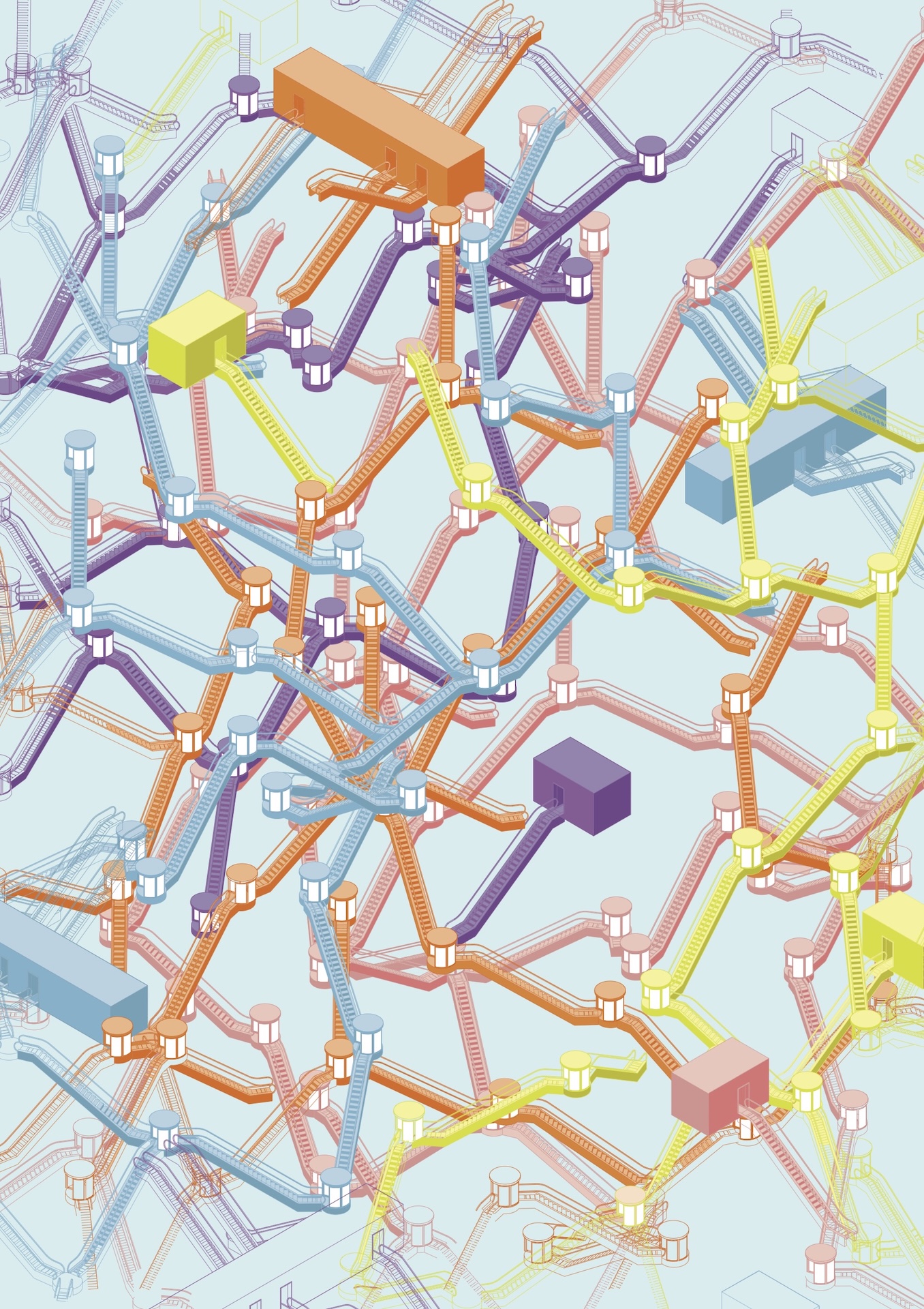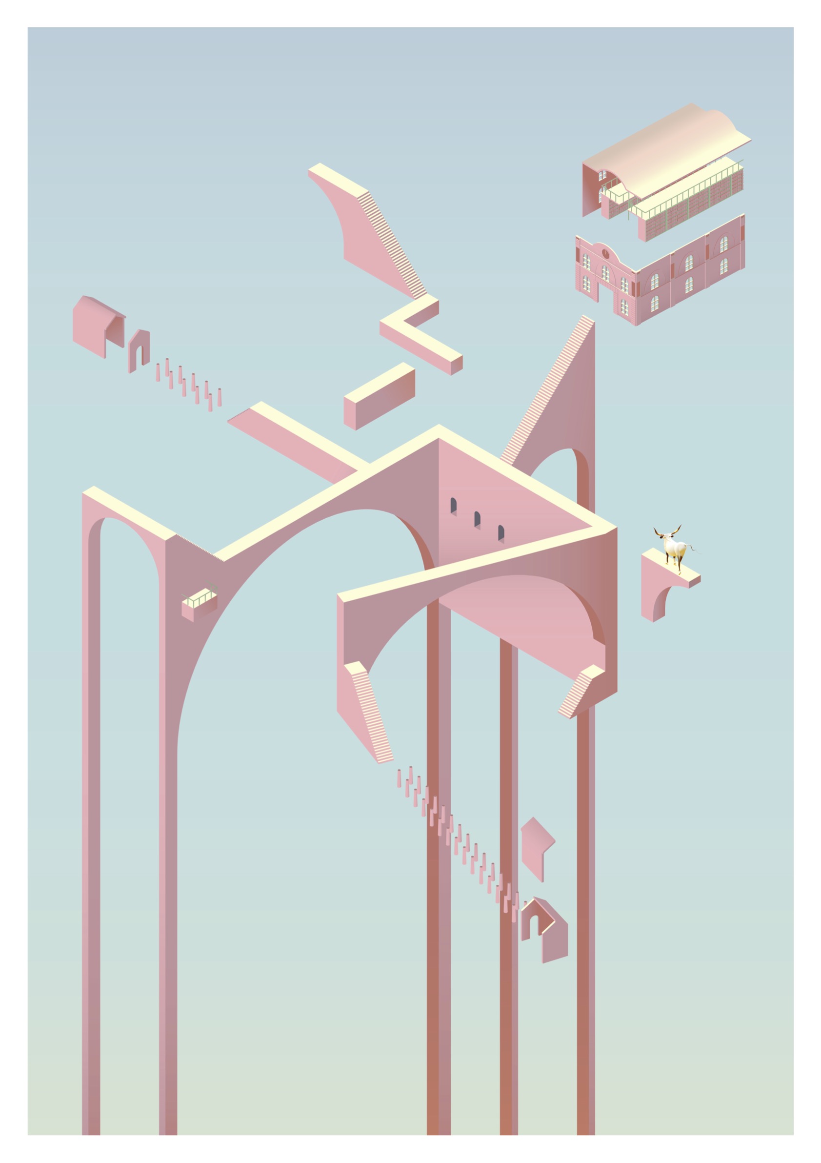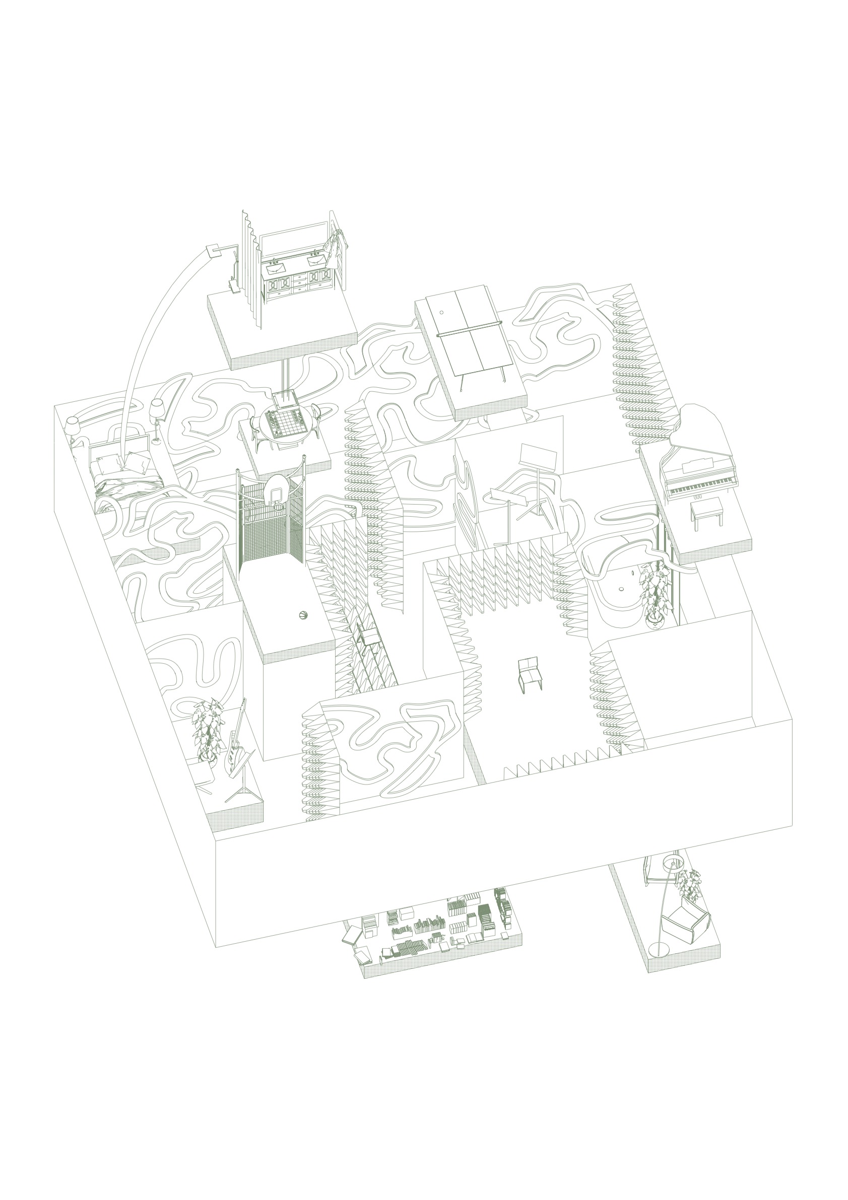 Raumverknüpfungen bilden einen grundlegenden Bestandteil unserer Wahrnehmung von Architektur. Sie bestimmen nicht nur die Struktur und Wirkung architektonischer Räume, sondern prägen auch unsere Bewegung und Orientierung in sämtlichen Bereichen des Lebens. Der Übergang von einem Raum in den nächsten geschieht meist beiläufig und unbemerkt. Doch wenn dieser Moment des Übergangs bewusst in den Fokus rückt, offenbart sich sein gestalterisches und atmosphärisches Potenzial. Durch das Extrahieren, Abstrahieren und Neukombinieren alltäglicher Räume entstehen neue räumliche Konstellationen zwischen Traum und Realität. Im Kurs „Espèces d’espaces“ entwickelten die Studierenden Zeichnungen experimenteller Raumsequenzen, die solche neu zusammengesetzten Strukturen visualisieren. Technik und Darstellungsweise waren frei wählbar; einzig die Axonometrie bildete die verbindliche Grundlage.